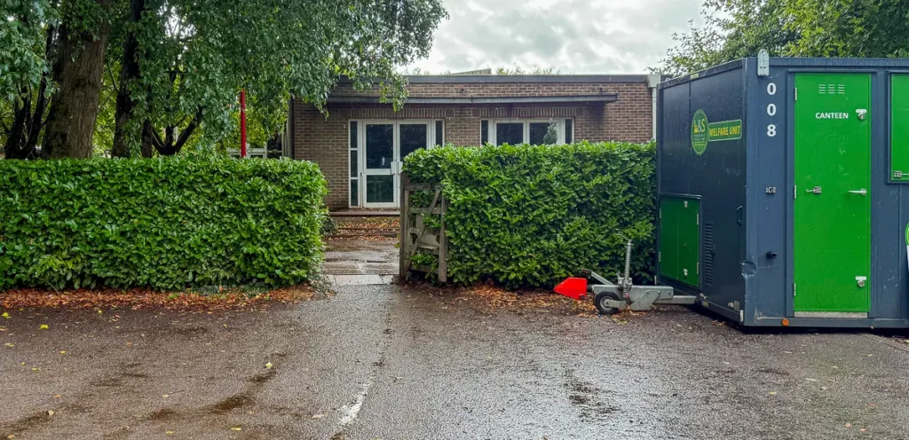 The foot path to the Tower auditorium leaves from the back of the car park, round the Tower to the red glass entrance door.